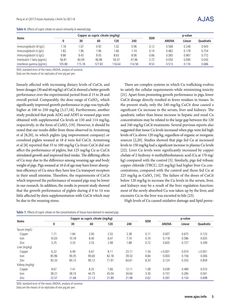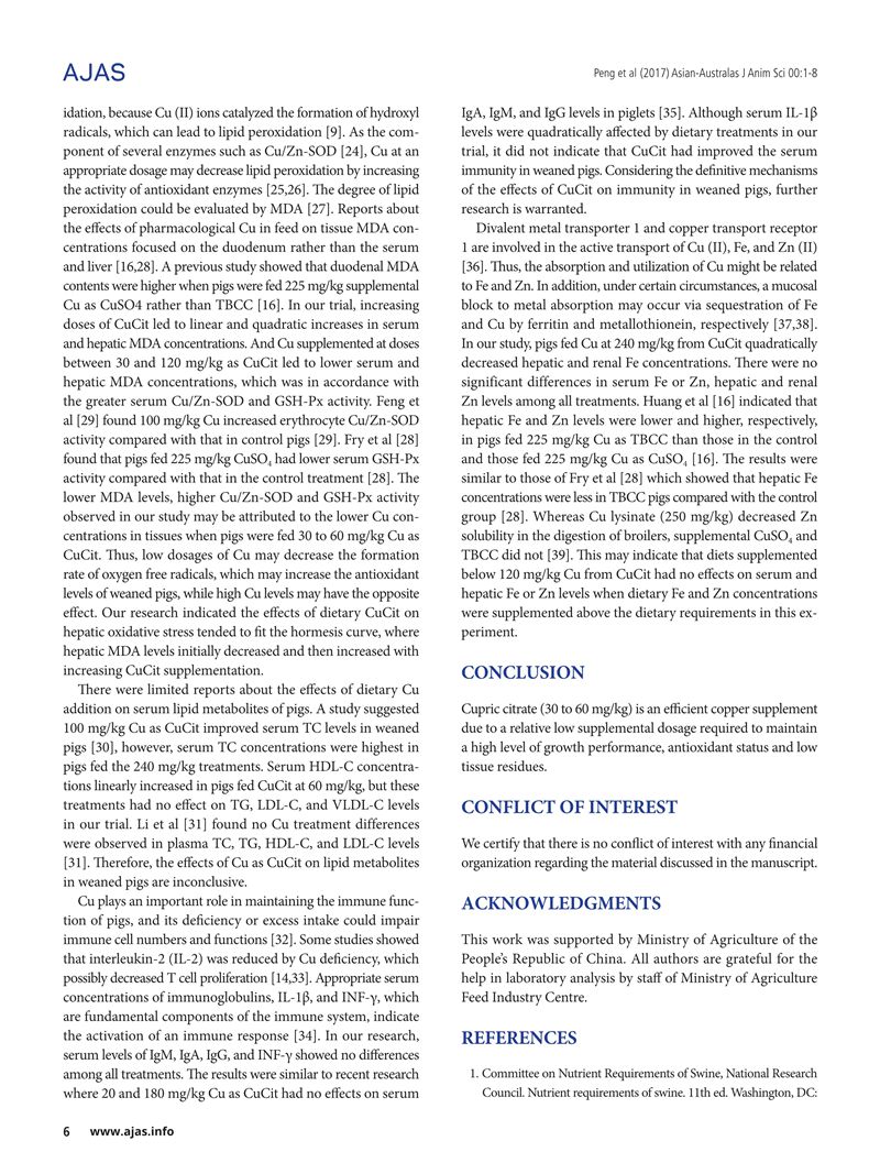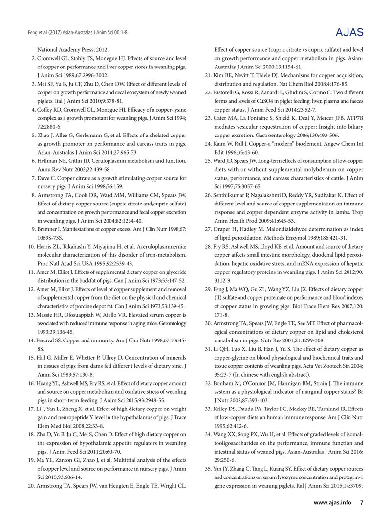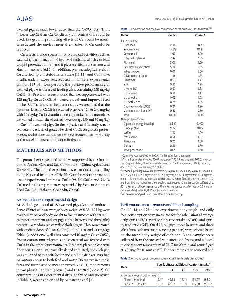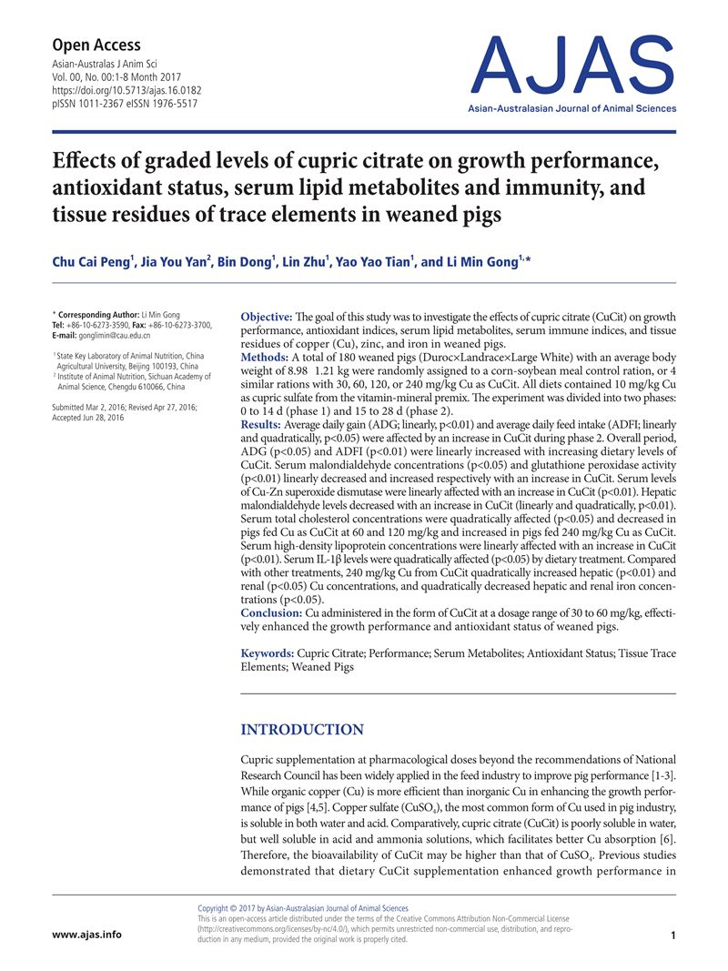 Effects of Graded Levels of Cupric Citrate on Growth Performance, Antioxidant Status, Serum Lipid Metabolites and Immunity, and Tissue Residues of Trace Elements in Weaned Pigs-晏家友.pdf