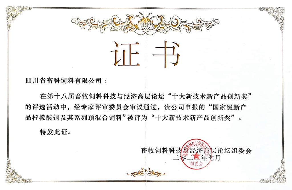 畜科公司總經(jīng)理、四川省畜科院動物營養(yǎng)研究所所長李書偉研究員率畜科技術(shù)營銷團隊出席大會。畜科公司、四川省畜科院研制的“國家級新產(chǎn)品檸檬酸銅及其系列預(yù)混合飼料”在激烈的競爭中獲得了專家組的一致好評,通過了專家組評審,榮獲2021-2022畜牧飼料行業(yè)“全國十大新技術(shù)新產(chǎn)品創(chuàng)新獎”。在畜牧飼料行業(yè)“奧斯卡”頒獎盛典上,畜科公司總經(jīng)理、四川省畜科院動物營養(yǎng)研究所所長李書偉研究員特邀其代表畜科上臺授獎。